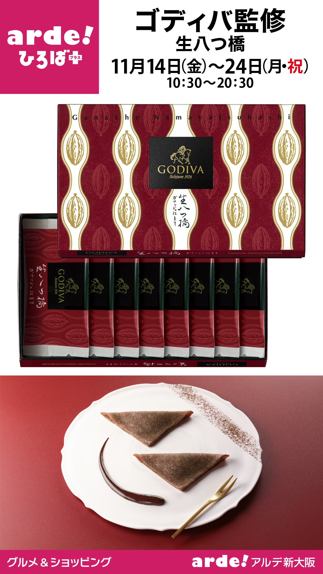 2025年11月14日(金)~11月24日(月祝)の期間、アルデ新大阪催事スペース「アルデひろばプラス」期間限定ショップにて、「ゴディバ監修生八つ橋」を販売いたします。 営業場所:アルデ新大阪催事スペース「アルデひろばプラス」 営業時間:10:30₋20:30