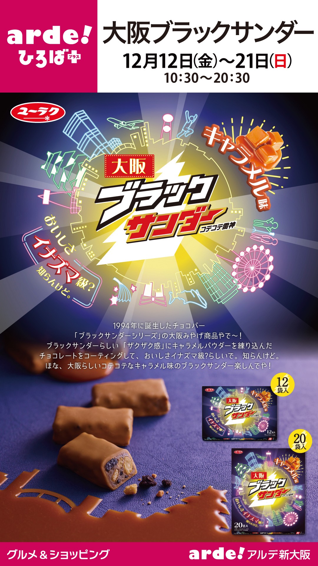 2025年12月12日(金)~12月21日(日)の期間、アルデ新大阪催事スペース「アルデひろばプラス」にて、期間限定ショップ「大阪ブラックサンダー」「京都ブラックサンダー」が営業いたします。