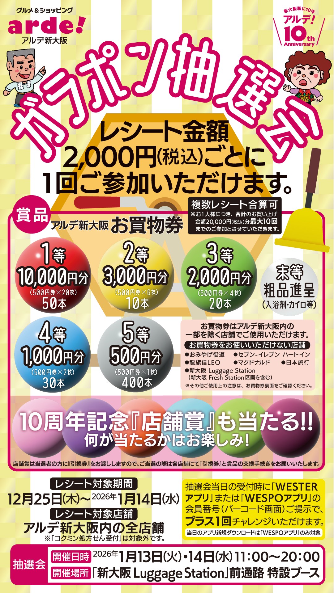 2026年1月13日(火)・14日(水)の2日間、「アルデ新大阪10周年記念ガラポン抽選会」を開催いたします。