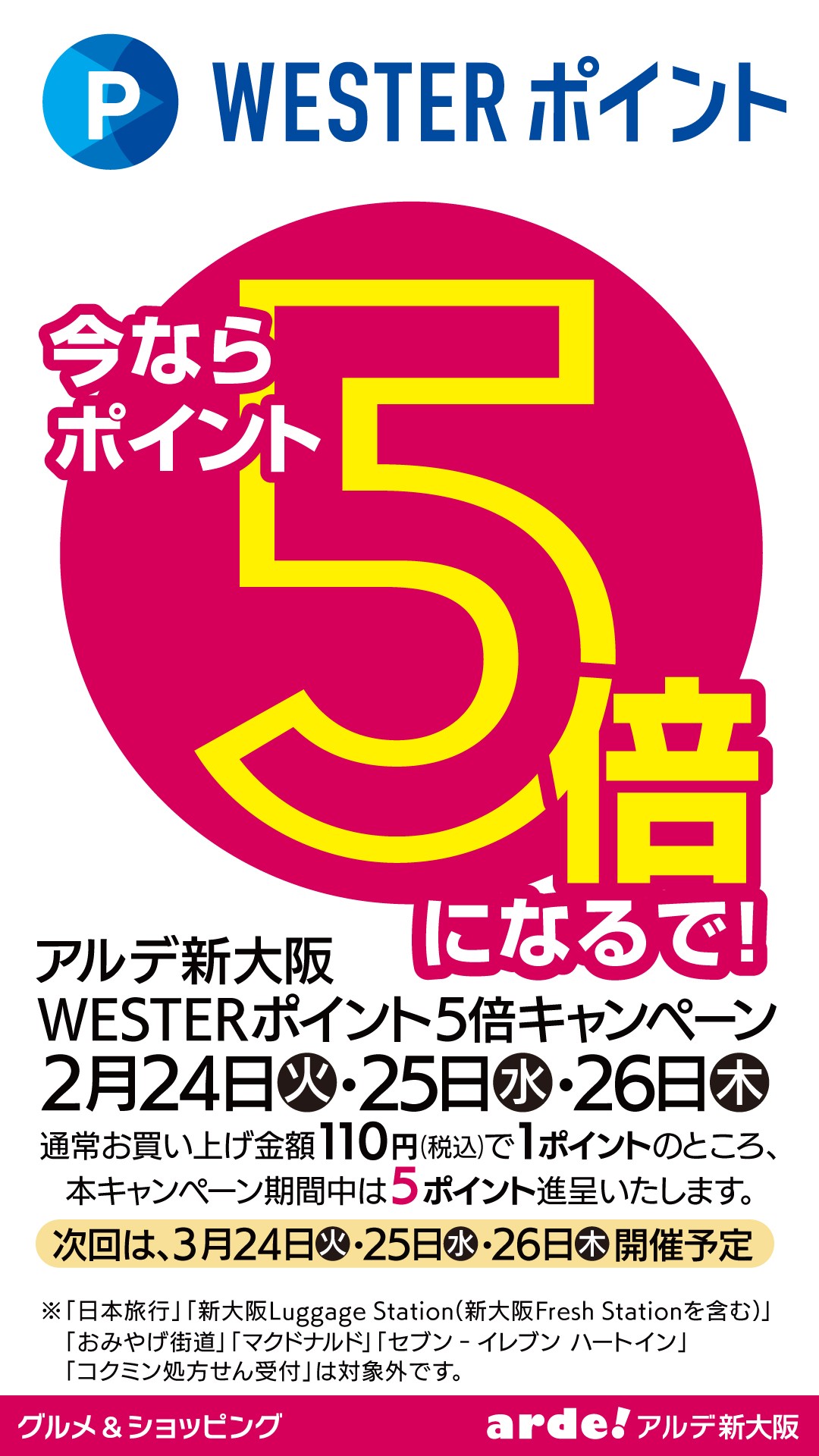 2026年2月24日(火)・25日(水)・26日(木)の3日間、「アルデ新大阪WESTERポイント5倍キャンペーン」を開催いたします。