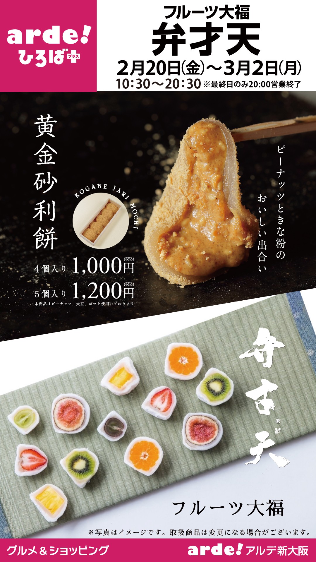 2026年2月20日(金)~3月2日(月)の期間、アルデ新大阪催事スペース「アルデひろばプラス」にて、期間限定ショップ「フルーツ大福 弁才天」が営業いたします。 営業場所:アルデ新大阪催事スペース「アルデひろばプラス」 営業時間:10:30₋20:30※最終日のみ20:00営業終了