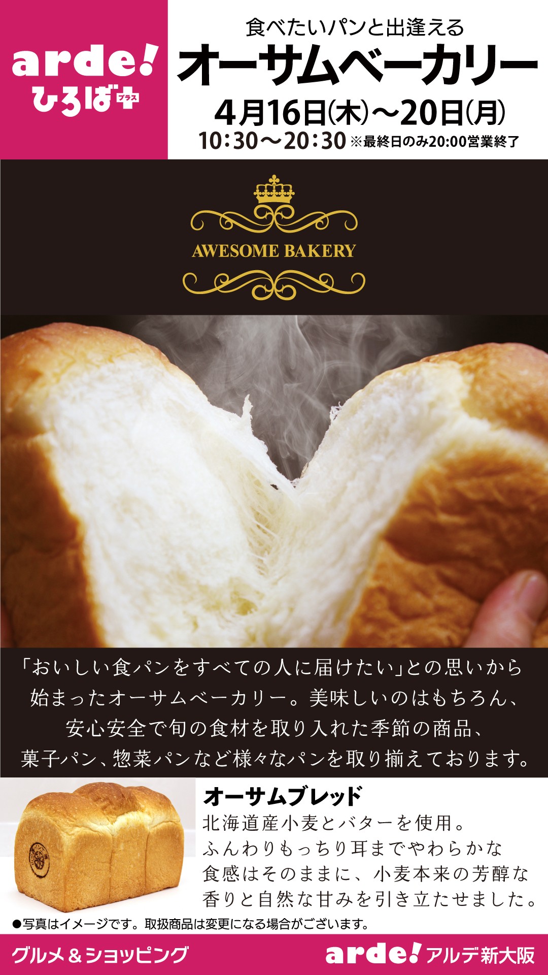 2026年4月16日(木)~4月20日(月)の期間、アルデひろばプラスにて期間限定ショップ「オーサムベーカリー」が営業いたします。 営業場所:アルデ新大阪催事スペース「アルデひろばプラス」 営業時間:10:30₋20:30※最終日のみ20:00営業終了